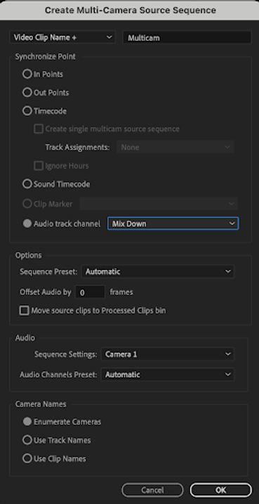 For the first method, one simply needs to select all the necessary video and audio clips in the project bin, right click and select Create Multi-Camera Source Sequence.