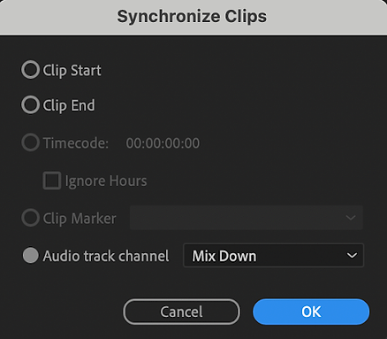 Sometimes this first method won’t quite work on everything. I know, total pain. If this happens to you, don’t worry. The second method is to just grab those clips and bring them into a new sequence. Normally, one would select all the clips in the sequence, right click them, select synchronize. Use the audio track channel option. (For this, I usually set the audio track channel to mix down, especially if the clip has multiple audio tracks.)