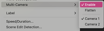 If this doesn’t work, it may have to be done the old fashioned way via the slate clap. Whatever the method of choice/necessity, once you’ve got the clips synced up, select them all and right click. Select nest. Now right click your nested sequence and select multi-camera > enable.